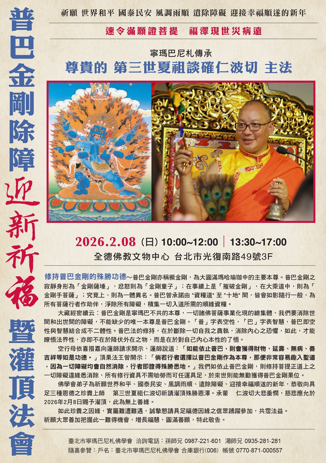 寧瑪巴尼札佛學會弟子為祈願世界和平、國泰民安、風調雨順、遣除障礙、迎接幸福順遂的新年,恭敬向具足三種恩德之珍貴上師──第三世夏祖仁波切祈請灌頂殊勝恩澤。承蒙 仁波切大悲垂憫,慈悲應允於 2026年2月8日賜予灌頂,此為無上善緣。