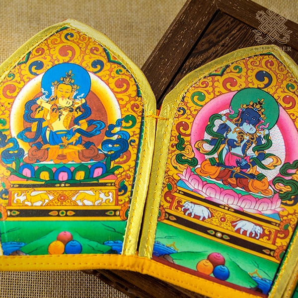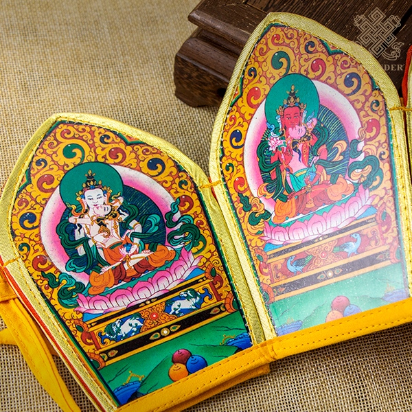 ◆寶生佛(身黃色)左手執金剛鈴,右手執摩尼寶珠,擁佛母,以金剛跏趺坐於蓮臺駿馬法座上。代表平等性智。