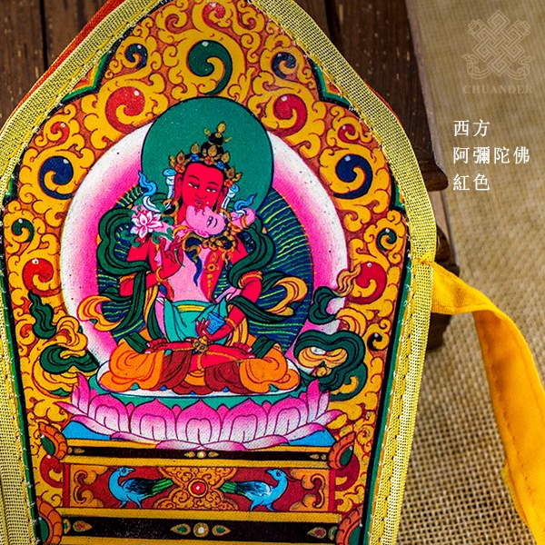 ◆阿彌陀佛(身紅色)左手執金剛鈴,右手執蓮花,擁佛母,以金剛跏趺坐於蓮臺孔雀法座上。代表妙觀察智。