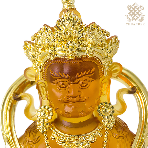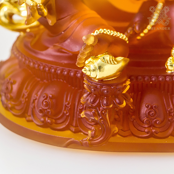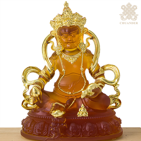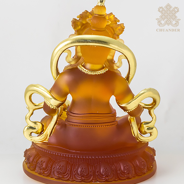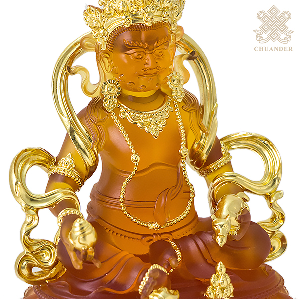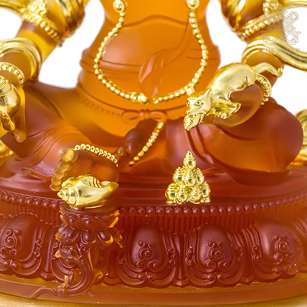 其身一面二臂,身黃挺肚,五佛冠為頭飾,花卉耳飾和項鍊;臂戴臂鐲,足飾足鐲;以綢緞寶貝作裝飾,上身著衣下身裙,右手持如意寶,左手抓著吐寶鼠,珠寶瓔珞作裝飾。左足屈,右足踩著海螺寶,以如意姿安坐於蓮花月輪之上。