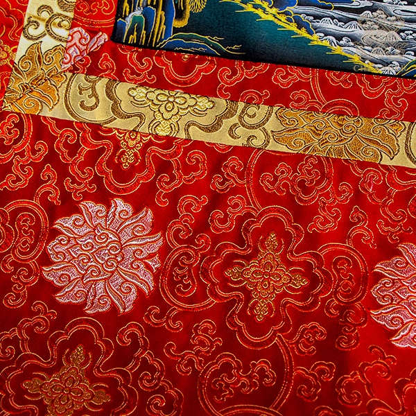 藏式蓮花布邊,軸心包邊處理。唐卡背面有受潮痕跡,如介意者請謹慎考慮是否請購,或重新縫布邊(價格另計)