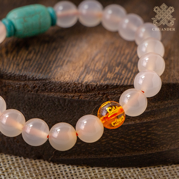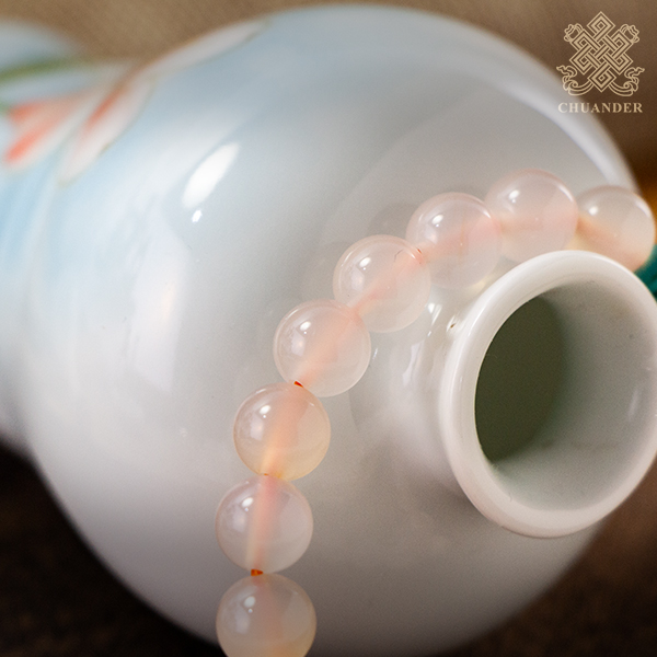 白玉髓是白色玉髓的泛稱,主要成分為二氧化矽,屬水晶一類。數量多、顏色豐富,且有濃淡深淺各種不同層次的表現,以「牛奶白」為上品。「牛奶白」具有乳脂般的色澤,顏色柔和瑩潔,搭配半透明的質地,益發顯得玉質溫潤細膩,看起來柔媚、捧起來溫婉,令人愛不釋手。據說白玉髓還具有消災避邪的功效,也可幫助增強體質,抵抗傳染性的疾病。