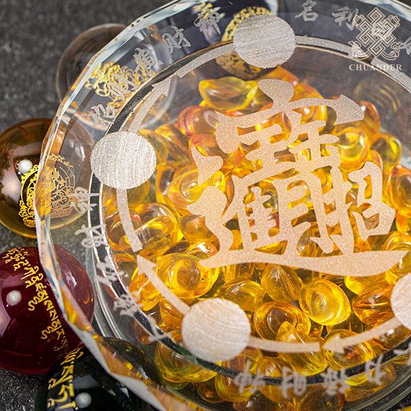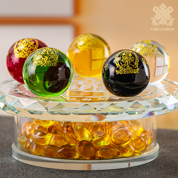 擺陣盤直徑約12cm、高約4.5cm;五色珠直徑約3cm,由於丈量方式的不同,因此尺寸可能有2%以內之誤差