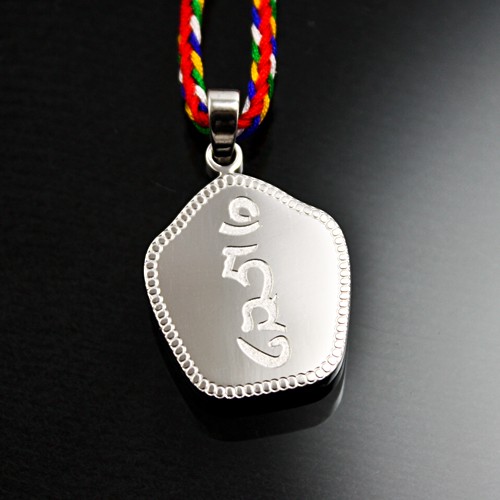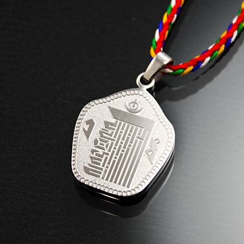本咒牌是藏傳佛教中常見的一種圖案,由時輪金剛咒中的七字、日月、圓圈,梵文字母形式豎向重疊寫成,其顏色分別為綠、紅、白、黃、五彩、白、藍,分別象徵風、火、水、土、五欲、身、無身、命、溫暖。
