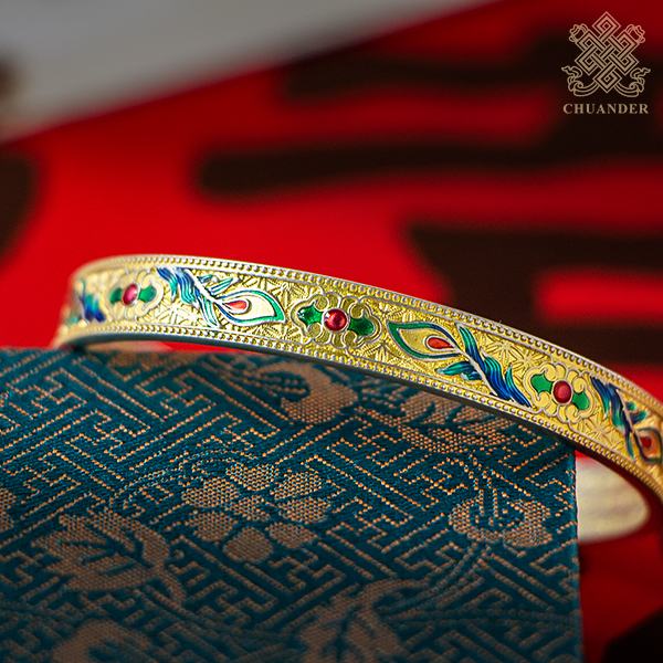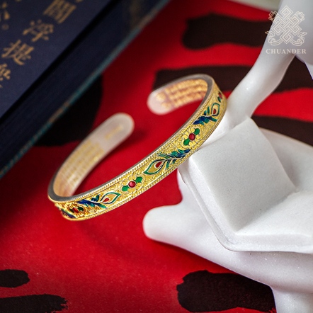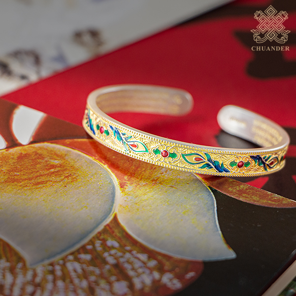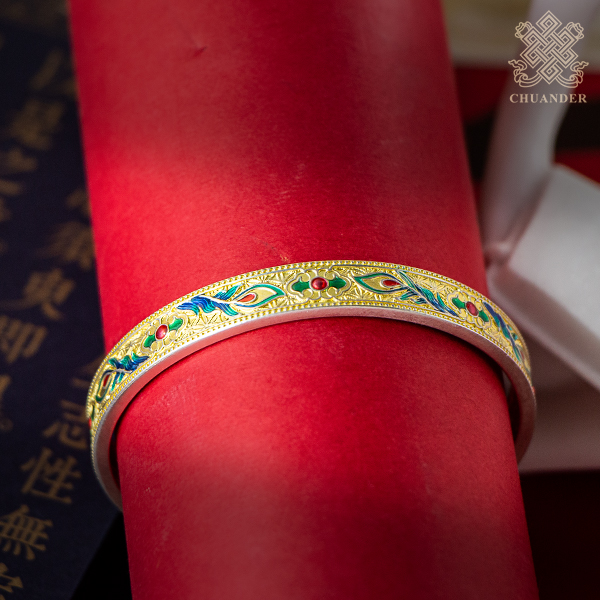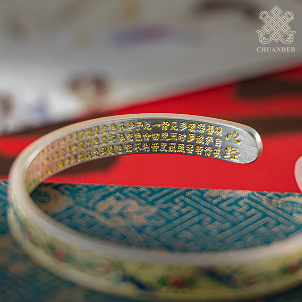 C型手環,外緣鍍金琺瑯彩繪蔓草,內緣刻心經