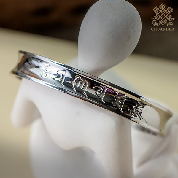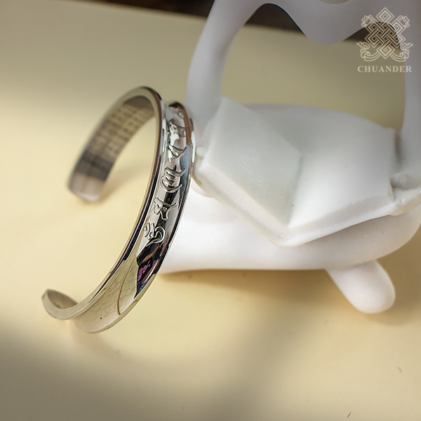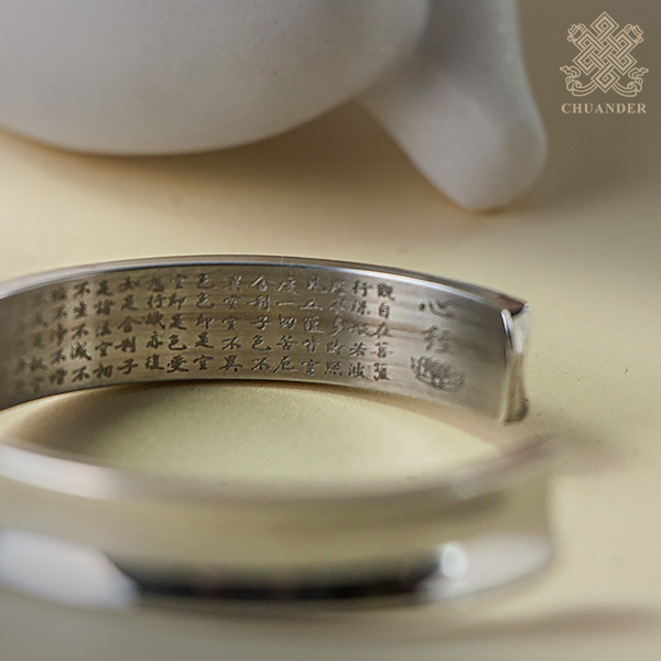 C型手鐲,外緣亮面呈凹型刻六字咒,內緣刻心經