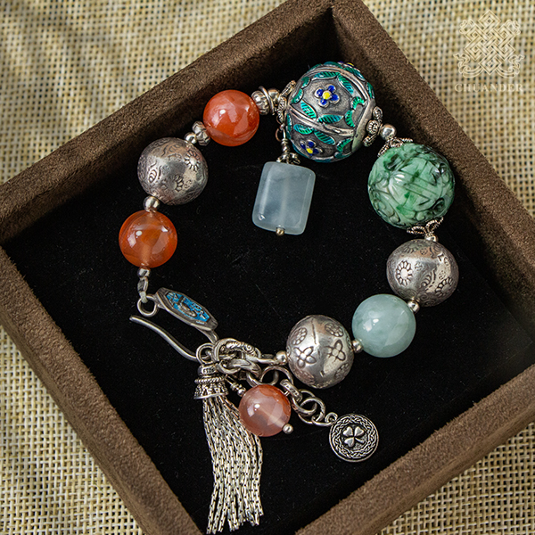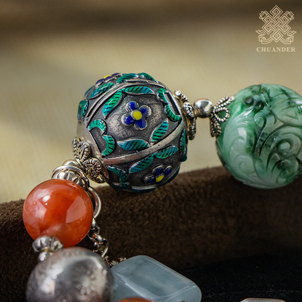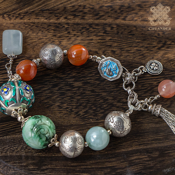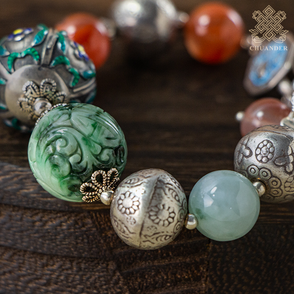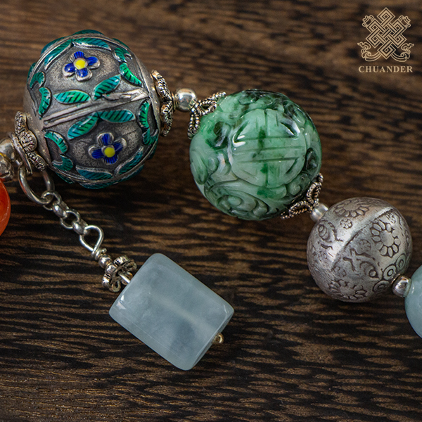 燒蘭純銀珠直徑約22mm、花青玉珠直徑約18mm,手圍直徑約4.5~5.5cm(可調整),由於丈量方式的不同,因此尺寸可能有2%以內之誤差。