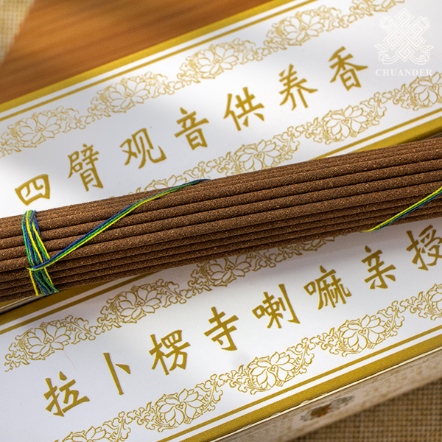 四臂觀音供養香,緣起於《四臂觀音燒食供養法》,是以青藏高原原產青稞麥洗淨、炒熟,研磨成粉,加以三白、三甘、六佳良藥;另配以玉蘭花、檀香、沉香、龍腦等數十種珍貴藥材精心調製而成。