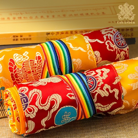 ◆略述使用包經布功德:佛教教義中,佛、法、僧被尊為三寶。「法寶」代表一切佛經及典籍,是佛陀教法的依據,所以被視為珍寶之一,因此經典法本儀軌的儲存、擺放也有一定規矩,例如:不可把法本、經典置在地上不潔處,以及不可跨過、踐踏佛經等。