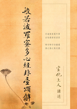 《心經》,顧名思義,指的就是般若心中的心。「般若」是智慧,「波羅蜜多」是到彼岸,即運用智慧心到達解脫自在的彼岸。短短兩百六十個字中,凝聚了佛陀六百卷般若空理的精華。宣化上人每句經文用八句偈頌來解釋,道破修行的妙理。心本無相,豈有臺乎?應無所住而生其心,故名為「心經非臺頌解」。