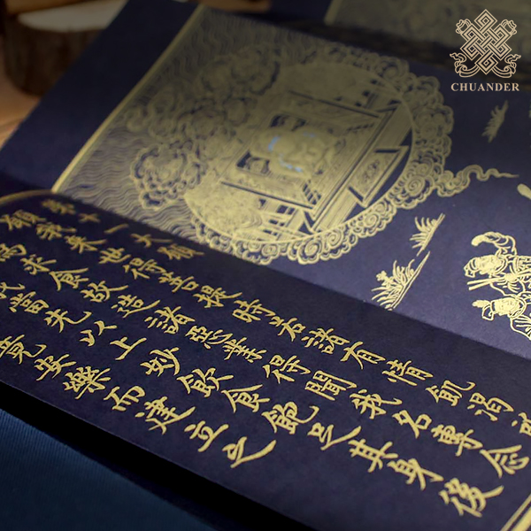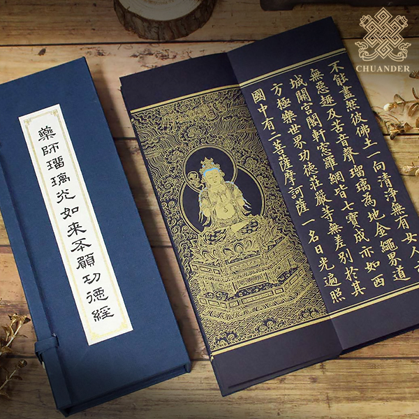 唐玄奘法師所譯。本經複製於明人泥金寫本,筆力遒勁,明快爽利;十二大願每一願文附以一圖,經中佛菩薩與藥叉大將亦附法相,便於發心觀想,勾畫細膩、莊嚴具足,一閱便生恭敬清涼之心。