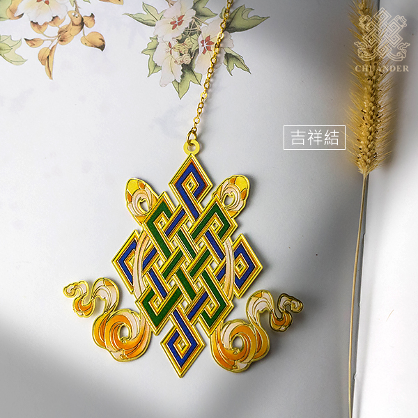 【吉祥結】又稱無盡意結,有連綿不斷之意。纏繞的線條代表一切現象的縱橫交錯,以及因緣之合合。由於一切現象都是依緣而生,因此常用在禮物或卡片上,象徵結緣以及吉祥之意;由於它無始亦無終,也象徵佛陀無邊的教法,以及無盡究竟的佛性。