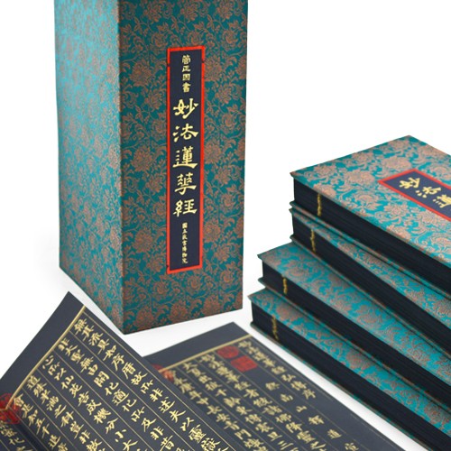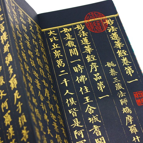 《妙法蓮華經》,簡稱《法華經》,梵云薩達摩奔荼利迦素呾攬,姚秦鳩摩羅什譯,七卷二十八品。鳩摩羅什所譯原僅二十七品,至南朝梁末真諦,始從梵文本再譯出提婆達多品,增置於見寶塔品之後。梵文「薩達摩」,中文意為「妙法、正法」,意指所說教法微妙無上;「奔荼利迦」意譯為「白蓮花 ,以蓮華為喻,比喻佛法之潔白、清淨、完美。