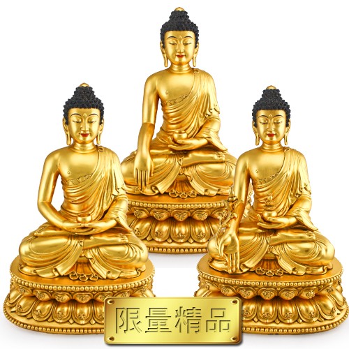 三寶佛,中間主尊為釋迦摩尼佛,兩側分別為代表西方極樂的阿彌陀佛,與東方淨琉璃世界的藥師佛。