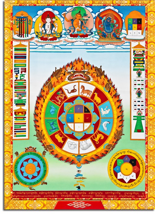 咒輪的中央上方是在佛教中象徵智慧、慈悲、力量的文殊、觀音、金剛手等三菩薩。左方為時輪金剛咒,可令宇宙時空所組成的世界一切自在。右方則是消除一切違逆障礙的迴遮咒輪。
