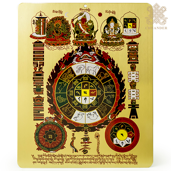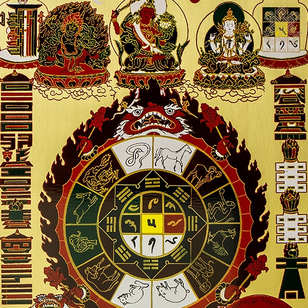 右方為時輪金剛十相自在咒,能令十方時空宇宙世界一切自在;左方是防護一切凶煞、障礙與不祥的迴遮咒輪,咒輪分為三圈,外圈是十二生肖,象徵十二地支,並配合天干演化成六十甲子;中圈是離、坤、兌、乾、坎、艮、震、巽等八種卦象,分別代表火、地、澤、天、水、山、雷、風等八種事物。內圈則繪製了河圖洛書九宮。圈外有一怒目獠牙捲舌並掌理日月星宿年月日時的凶神羅喉,中國稱為太歲星君;右下方的咒輪是一切音聲的韻母及緣起咒,可增長善緣福德,並吸收日月天地間的精華;左下方的咒輪則能迴遮一切違緣。