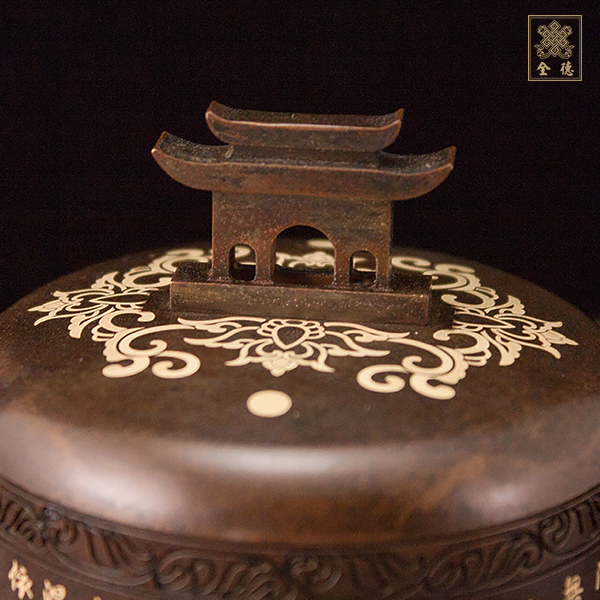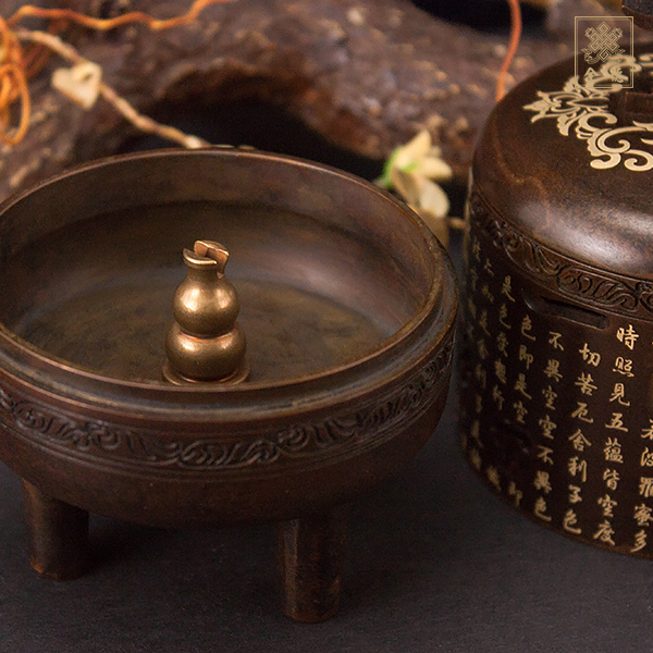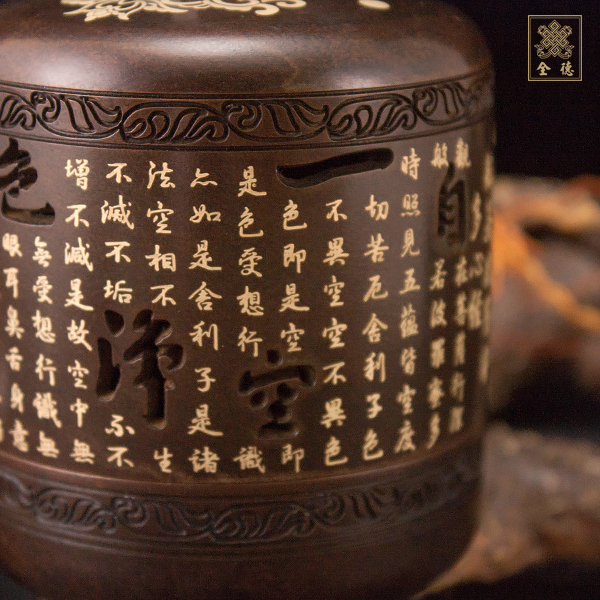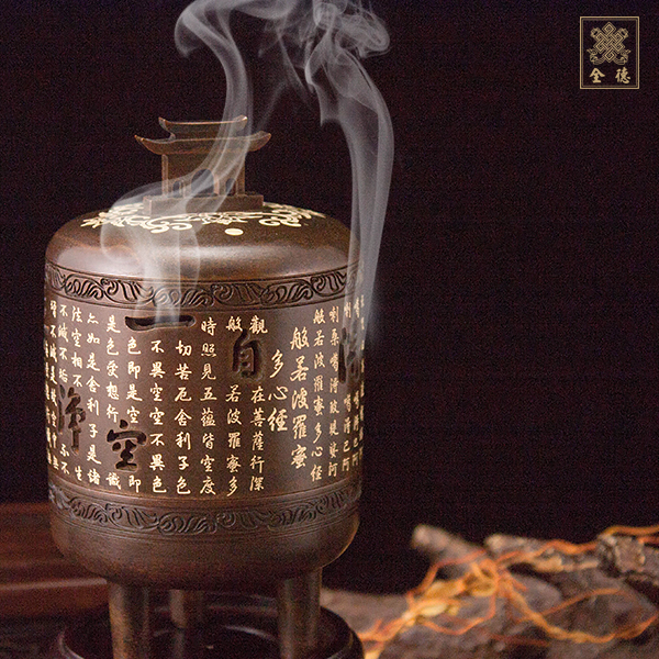 爐面刻心經部分鏤空,上蓋為牌樓造型。適合2小時環香、香塔,附葫蘆香座1個。