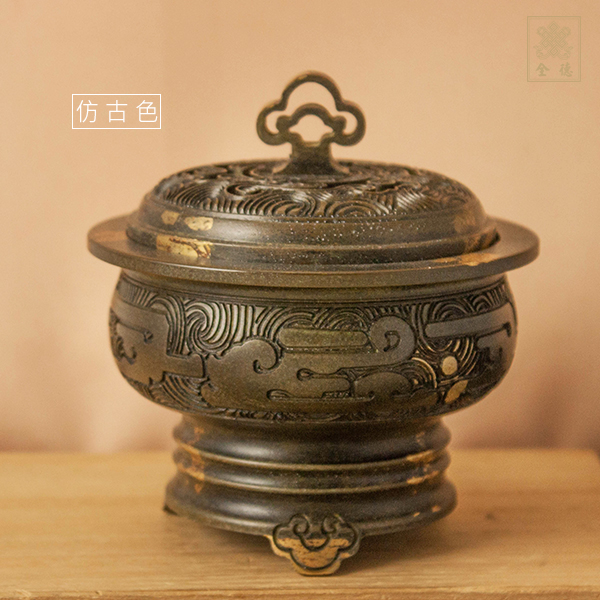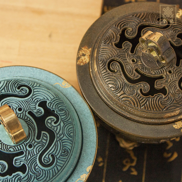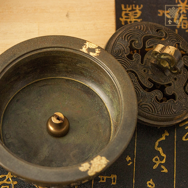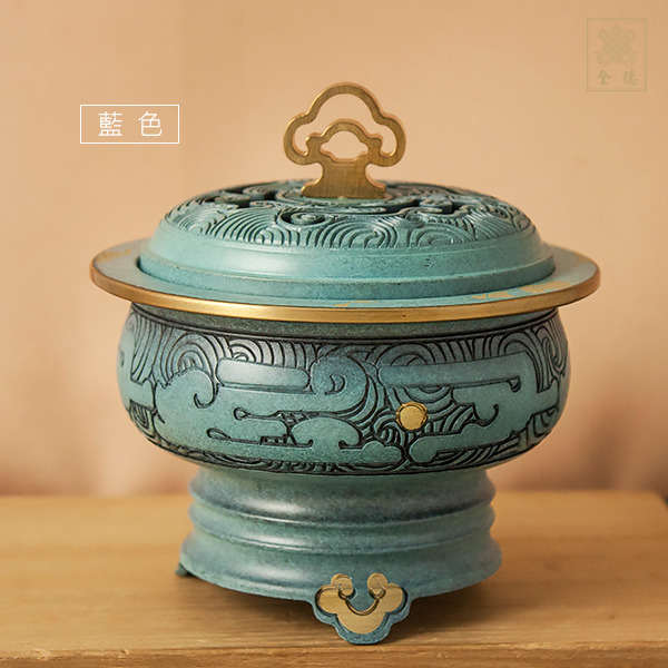 三足仿古造型,祥雲夔龍鏤空上蓋,適合四小時香環、香粉、香塔等。附小香座1個。