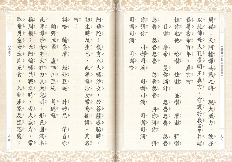 《佛母大孔雀明王經》是最早在漢地翻譯和傳播的密教經典。其漢譯本有六種之多。收錄於「元藏」、「清藏」、「中華藏」等大藏及日本之「大正藏」、高麗王朝之「高麗藏」。流傳在民間的各種經折本、手抄本、石刻經、經幢以及出土的遺蹟殘卷等,分佈地域之廣,遍佈大江南北,時間之長,遍及歷朝歷代。