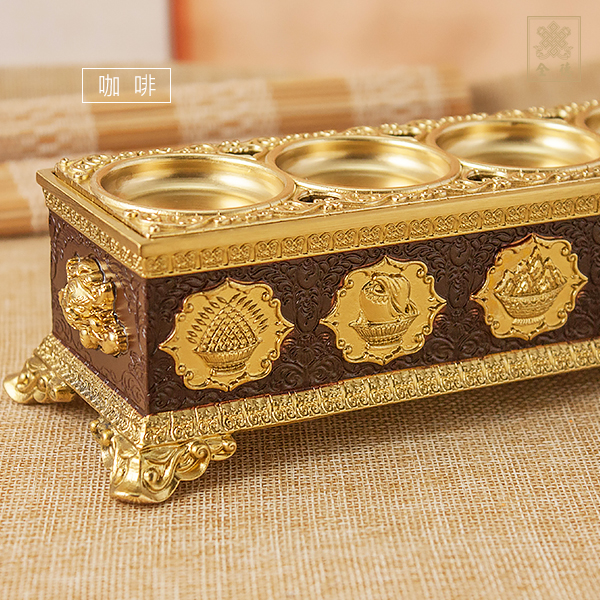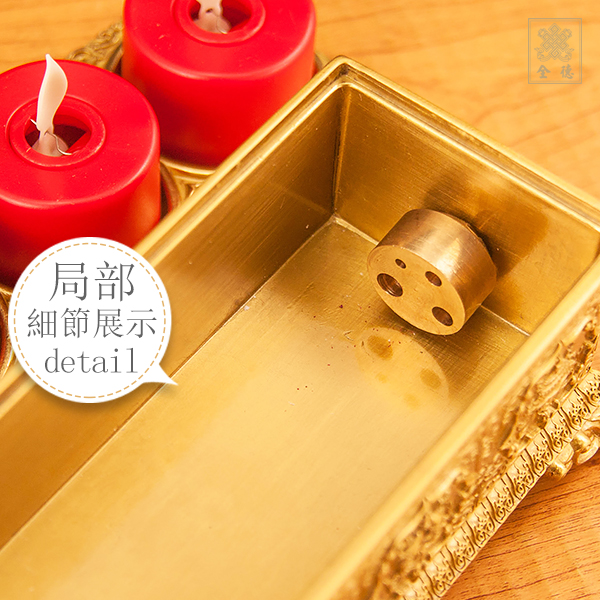 供燈、臥爐兩用,臥爐兩側分別刻有八吉祥及八瑞物,附四種粗細尺寸香座1個,適合9吋內線香、臥香。商品出貨不含擬真火焰蠟燭。