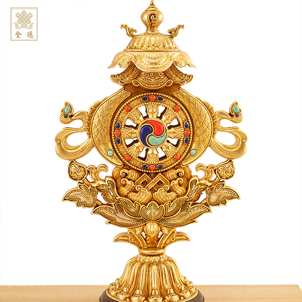 【法輪】在佛典上與修行的戒定慧三學有關:輪軸代表「戒」,藉著它,心始能持住穩定;輪輻代表「慧」,空性知識慧,以此斬除無明;而輪框則表示「定」,覺性與專注。也象徵佛法的圓融和完滿,它無始無終,剎那間可動可止,正代表法教的完整和圓滿,以及希望廣為宏揚之祈願。
