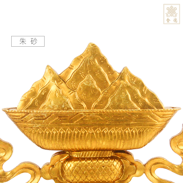 朱砂又稱紅丹,乃一種天然顏料,常在法會中使用,點於額頭中央。當它被用以粉狀供養時,則象徵一種精神層面的力量,表示心能自在,自己作主,也表示一種獲得知識與智慧的力量。