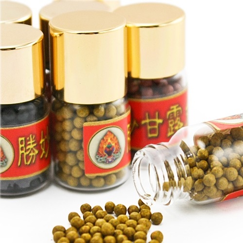 此勝妙甘露丸,乃以大成就者聖物、舍利、諸珍貴妙品,經由諸多成就上師暨僧眾,以殊勝清淨力依不同法門修持持咒加持所煉製。