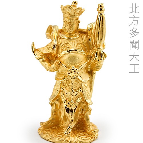北方多聞天王,又名毗沙門,「多聞」意為精通佛法,以福德聞於四方。住須彌山黃金埵,身為綠色,穿胄甲,右持寶傘(或做寶幢),左握寶鼠,用以制服魔眾,護持人民財富,又名施財天,是古印度的財神,他負責守護北俱蘆洲,是『二十諸天』中的第三天王。