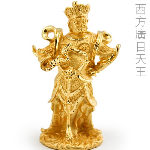 西方廣目天王,「廣目」意為能以淨天眼隨時觀察世界,護持人民,故名廣目天王。住須彌山水晶埵,身為紅色,穿胄甲,為群龍領袖,故手纏一赤龍(或做赤索),看到有人敵對佛教,即用繩索捉來,使其皈依佛教。他負責守護西牛賀洲,是『二十諸天』中的第六天王。