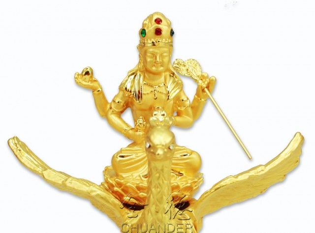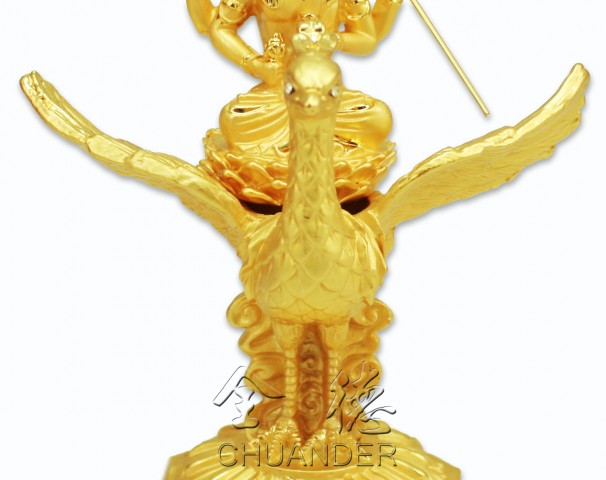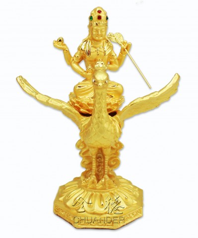 「孔雀明王」乃「佛母大孔雀冥王」之簡稱,為大日如來(毘如遮那佛)所示現。祂有別於一般明王威嚇忿怒之相,而是顯得慈悲、莊嚴、寂靜、凝定。修習孔雀明王可轉乖戾成祥和、轉鬥爭成禮讓、轉病痛成健康、轉娑婆成淨土。