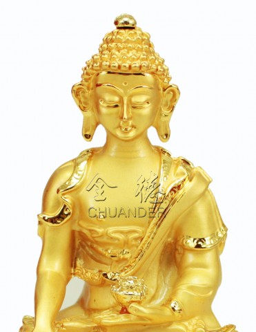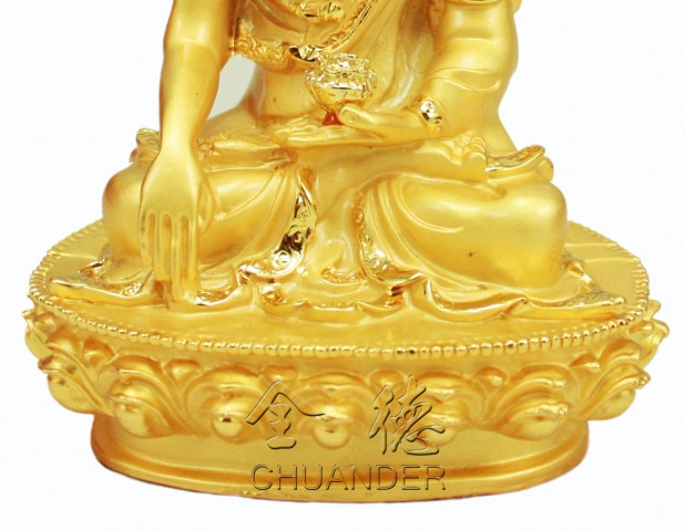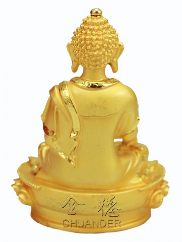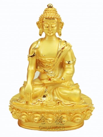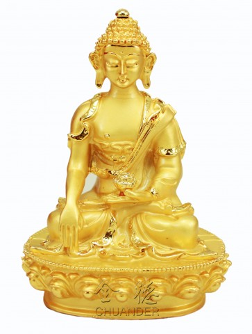 釋迦牟尼佛,釋迦意為能,牟尼意為仁,即能仁之意。誕生於西元前541年,出身印度無垢釋迦王族,父淨飯王、母摩耶夫人。年少即精通六十四種技藝,娶耶穌陀羅為妻,因感有情生老病死苦,於二十九歲時離家剃髮修行,於尼蓮禪河畔林中苦行六年,三十五歲四月十五日夜,降服眾魔、證悟成佛。八十一歲四月十五日於拘屍那伽圓寂。終其一生三轉法輪隨緣度眾,初於瓦納拉西轉四諦法輪,次於王舍城、靈鷲山,轉性相法輪及分別抉擇法輪。 圖中釋迦牟尼佛,身紫磨金色,著三法衣,相好莊嚴。右手觸地印、左手結定印持缽,雙足金剛跏趺座。