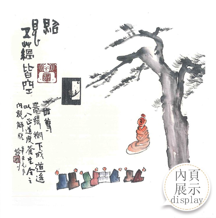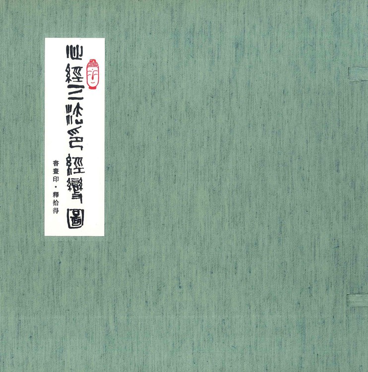 《心經》是釋尊開示照見五蘊皆空,度一切苦厄的究竟心要。拾得法師三十歲以前為母親刻下第一套,到了二〇二〇年,六十六歲刻下第五套。五十三句《心經》,以佛像或圖騰融入,如同微版畫,更以水墨畫及書法詮釋經文,形成三法印經變圖。