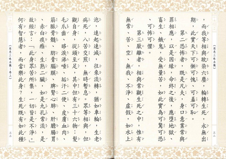 《慈悲三昧水懺》內容說明各種罪過可能發生的果報,更揭示眾生罪業產生的原因,期使眾生不再造作種種的業因。跨越千年時空,《水懺》舉出的種種罪相, 依然切中現代人的內心問題。 展開懺本,隨著懺文一一看見自己的種種過失與煩惱習氣。 坦承過失之後,帶著清凈身心領納清涼法水, 為生命開展安樂自在的新氣象。