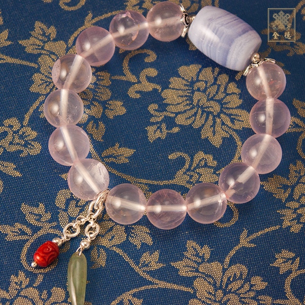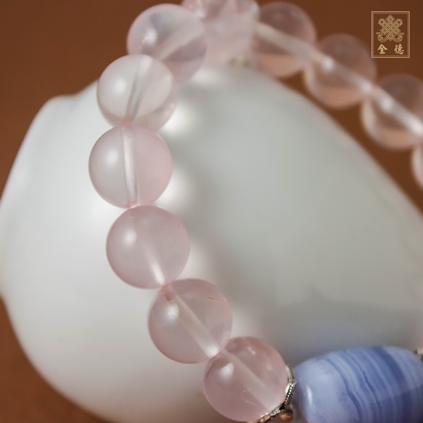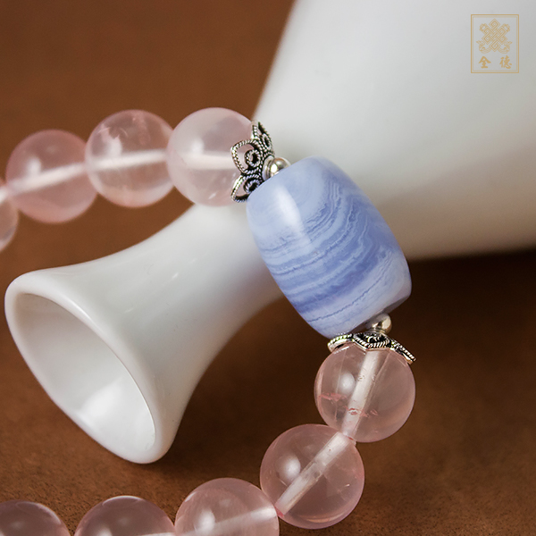 手珠-藍紋瑪腦筒珠+粉晶12mm