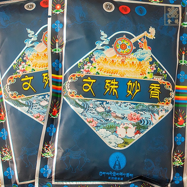 文殊妙香配料:藏沉香、高山薔薇、藏紅花、白花龍膽、加是布、弄事剌等近五十種香料。復加緣起物,緣起物於淨處持咒,傳承而製。具功德,香味芬馥,清新醇厚。密封乾燥保存,儲愈久愈醇厚,可謂三門喜悅之勝智香。