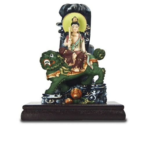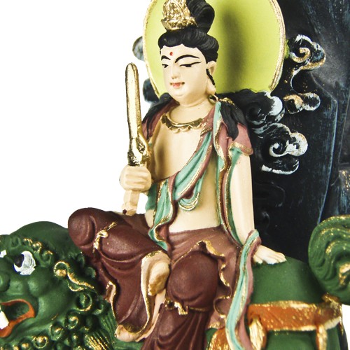 文殊菩薩,全名為「文殊師利菩薩」,梵名曼殊失利,譯為妙吉祥、妙音、普首、濡首、敬首等,是大乘佛教最古老的菩薩之一,顯教中常與普賢菩薩成對,隨侍釋迦牟尼佛之左右,專掌智慧門。祂是諸佛之師,也是勇於追求究竟真理的勇士,在諸菩薩中,號稱智慧第一,祂帶給眾生最好的禮物,就是彰顯「諸佛的智慧」,以及永保年輕、活力、勇往直前的精神。依「大佛頂首楞嚴經」所載,此尊以前曾稱為龍種上尊王佛,故亦稱為「文殊佛」,密號吉祥金剛或般若金剛。