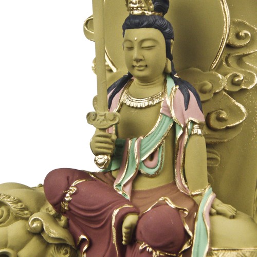 文殊菩薩,全名為「文殊師利菩薩」,梵名曼殊失利,譯為妙吉祥、妙音、普首、濡首、敬首等,是大乘佛教最古老的菩薩之一,顯教中常與普賢菩薩成對,隨侍釋迦牟尼佛之左右,專掌智慧門。祂是諸佛之師,也是勇於追求究竟真理的勇士,在諸菩薩中,號稱智慧第一,祂帶給眾生最好的禮物,就是彰顯「諸佛的智慧」,以及永保年輕、活力、勇往直前的精神。依「大佛頂首楞嚴經」所載,此尊以前曾稱為龍種上尊王佛,故亦稱為「文殊佛」,密號吉祥金剛或般若金剛。