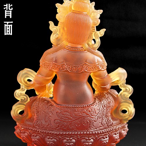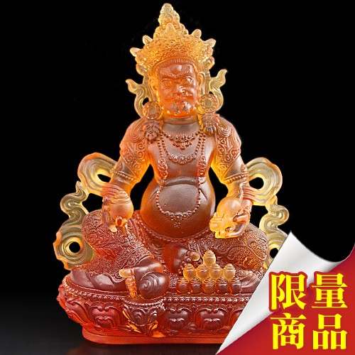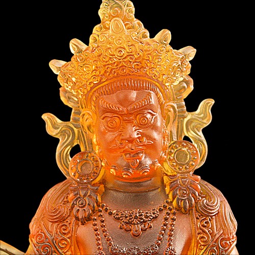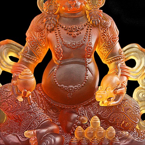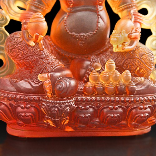 黃財神乃寶生佛的化現。身黃色,一面二臂,右手持聚寶果,左手握吐寶鼠。頭戴寶冠飾摩尼寶,著天衣、眾寶瓔珞以為莊嚴。雙足菩薩如意坐姿,右腳輕踩海螺上,安住於蓮花月輪座。黃財神屬密續中之作部,修習此法當以無上菩提心為本,發心利益有情,自然如願成就。可袪窮困之苦,增上順緣受用無慮。
