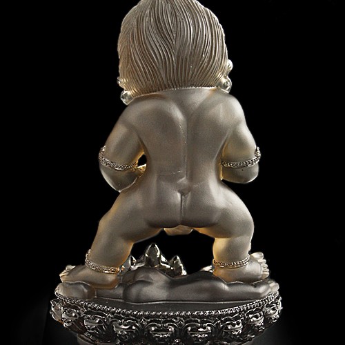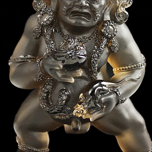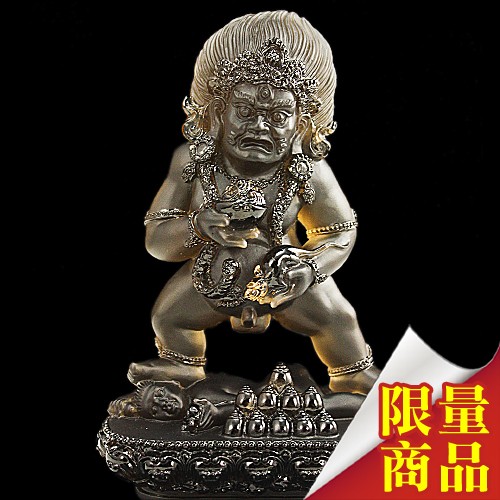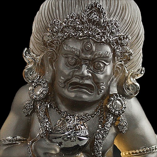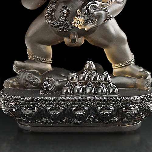 黑財神乃不動佛之化現。身黑色,身形矮胖,一面二臂三目圓睜,頭戴寶冠飾摩尼寶。右手持盈血嘎巴拉,左手握吐寶鼠。雙足右曲左伸立於黃色持財天之背上,安住於蓮花月輪座。修習此法當以發菩提心為本,自然如願成就一切,袪除違緣障礙,增長受用。