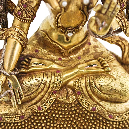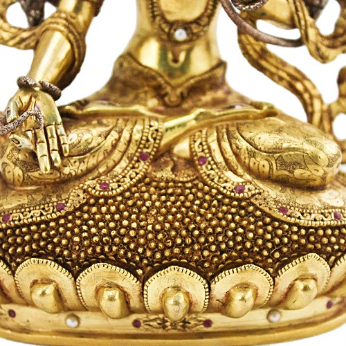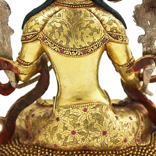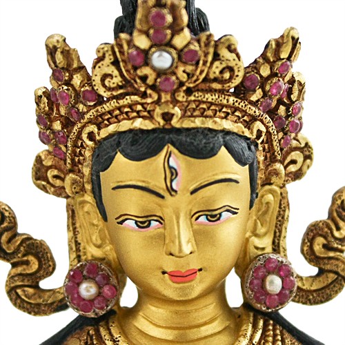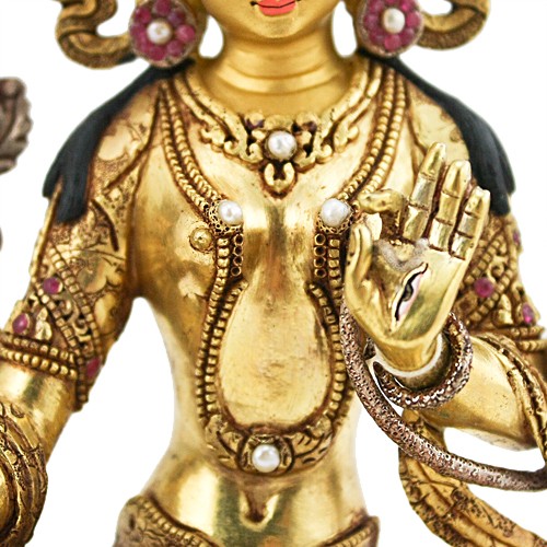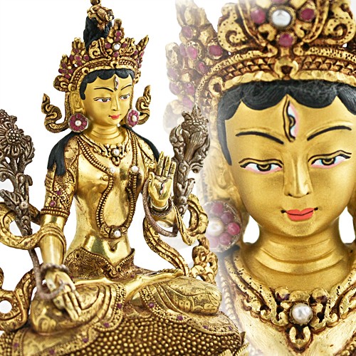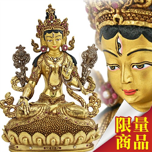 白度母又稱長壽度母,據傳為觀世音左眼悲淚所化,因於臉上三眼、雙手、雙腳各具一眼,故稱「七眼佛母」。