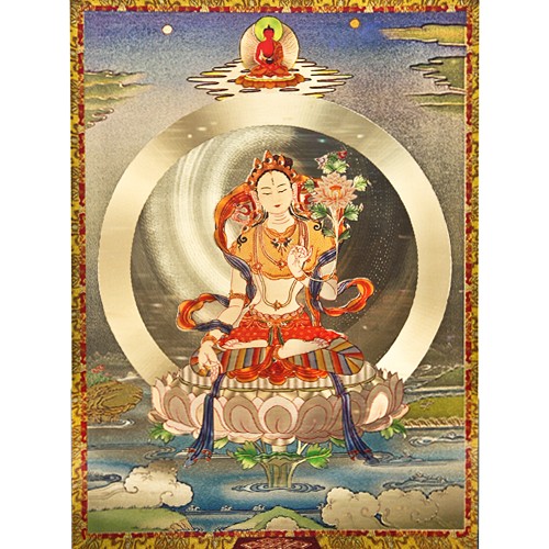 據傳白度母為阿彌陀佛左左眼悲淚所化現。全身白色,一面二臂、雙腳金剛跏趺坐。臉具三眼,手心、足心亦各具一眼。共七眼故,又稱七眼佛母。七眼表觀十方佛土無有障礙,觀六道有情令得解脫。 修持白度母法,能遮止非時死之障礙。能增長壽命、福德、智慧,斷輪迴之根,免除一切魔障、瘟疫、病苦,凡有所求無不如願。