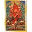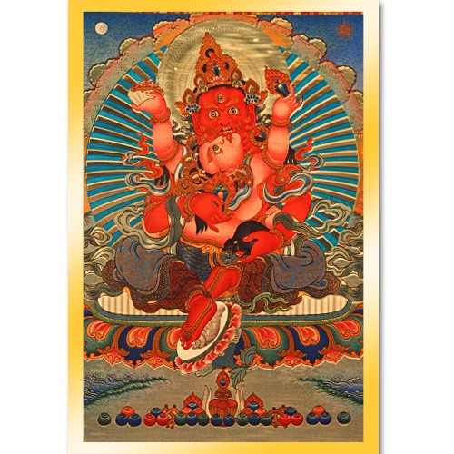 紅財寶乃金剛薩埵的化現,以雙運相顯現。本尊身紅色,一面二臂,右手持摩尼寶,左手握吐寶鼠。雙足菩薩如意坐姿,右腳輕踩海螺上,安住於蓮花月輪座。與佛母交抱,佛母財源天母,身淺紅色,右手持摩尼寶,左手持嘎巴拉。皆頭戴寶冠飾摩尼寶,著天衣、眾寶瓔珞以為莊嚴。 紅財神屬密續中之瑜珈部,修習此法當以無上菩提心為本,發心利益有情,自然如願成就。能招攝人緣、財富、飲食、名聞等一切受用。