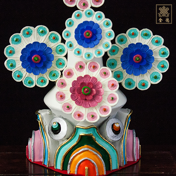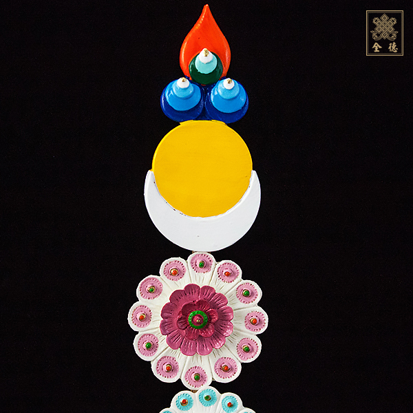 食子乃藏密特有的東西,通常以青稞粉(或麥粉)加上奶油,染色或著色捏製而成。顏色的搭配非常鮮豔亮麗,但不失協調有序,極盡顏色之遊戲。