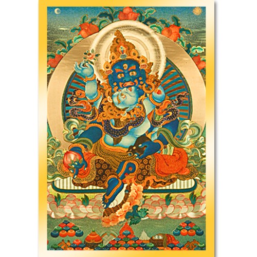 綠財神乃不動佛之化現。以雙運相顯現,本尊身綠色,一面二臂三目,頭戴寶冠飾摩尼寶,著天衣、眾寶瓔珞以為莊嚴。右手持滿願寶果,左手握吐寶鼠。雙足菩薩如意坐姿,右腳輕踩海螺上,安住於蓮花月輪座。與佛母交抱,佛母財源天母,身淺綠色,右手捻鄔婆羅花。 綠財神屬密續中無上瑜珈部,欲修習此法當先圓滿其他四財神法,以無上菩提心為本,自然如願成就一切,增長諸受用。