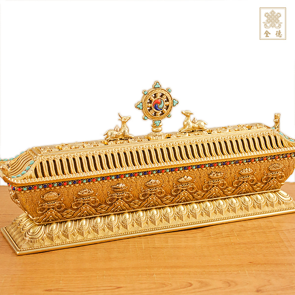 臥香爐是香爐的一種,因將香平放在香爐裡點燃而得名,也叫睡香爐,有香灰不散落在佛台可使供台莊嚴不零亂的優點,其香爐本身的設計也是美化供桌的一個重要器具。本商品「寶宇臥香爐」因其爐蓋設計形似宮殿屋檐而命名為「宇」,爐身雙面精雕有八吉祥及八瑞物而名為「寶」,故稱「寶宇臥香爐」;供佛之香,以香表信,以煙為緣起,煙雲中意觀幻化無量珍寶供品,遍滿宇宙大千,佛殿供台擺放此寶宇臥香爐實乃莊嚴殊勝無比。
