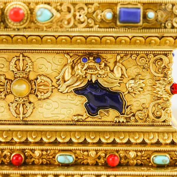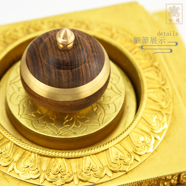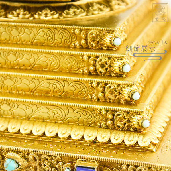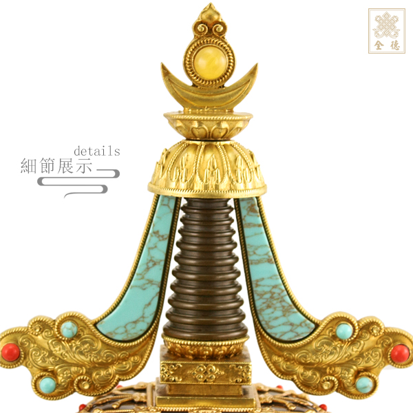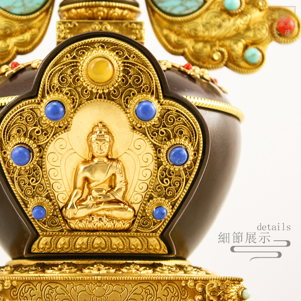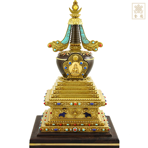 精雕仿古色,底部可裝藏,塔內小舍利缽轉開上蓋可裝藏;附木底座。