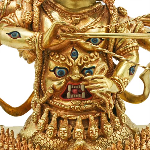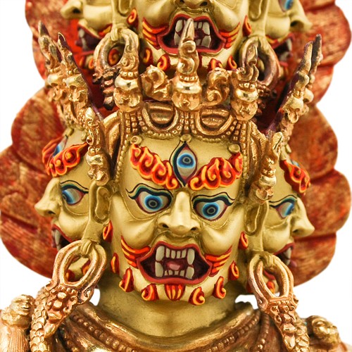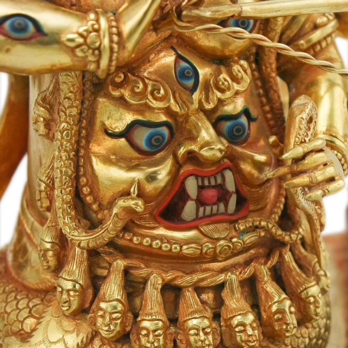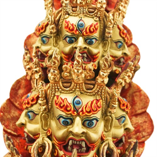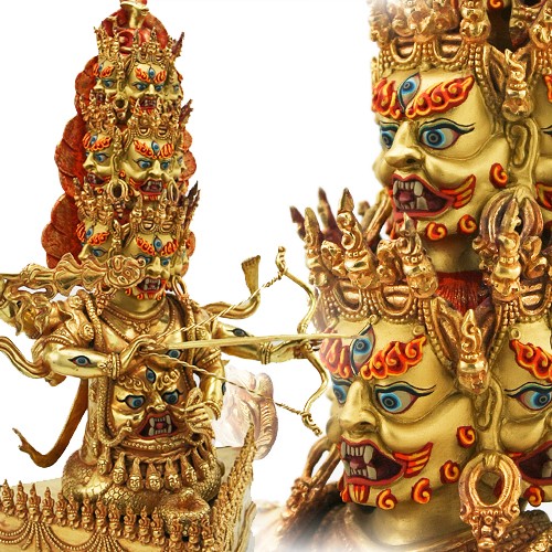 喇呼拉護法,身煙灰色九頭四臂。下三首中黑色、兩旁藍色。中三首中藍、右黑左紅。上三首中白、右藍左紅。頂上有老鴉首。九首皆戴五骷髏冠。四臂主二手持弓箭,次二手持羯摩海怪幢與蛇繩。