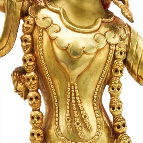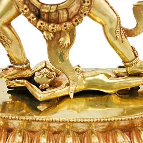 一面二臂身褐紅色,獨目居於額頭中央,獨齒尖銳如普巴杵,一髮撐天,頭戴五骷髏冠,獨乳居胸正中。右手高舉人屍,左手執魔心與豺狼。披人皮衣、著虎皮裙,族右曲左身立於蓮花日輪屍座上。