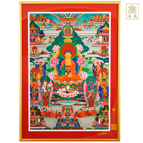 此唐卡依據噶瑪恰美仁波切「極樂願文」繪製,唐卡中佛菩薩由百年前噶陀 · 司徒確吉嘉措瑪哈班智達布局。