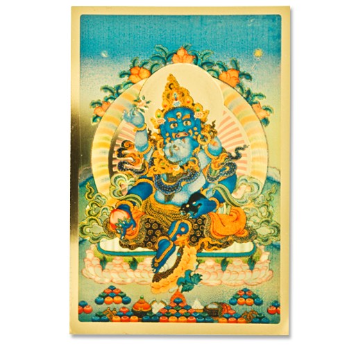 本尊身綠色,一面二臂三目,頭戴寶冠飾摩尼寶,著天衣、眾寶瓔珞以為莊嚴。右手持滿願寶果,左手握吐寶鼠,雙足菩薩如意坐姿,右腳輕踩海螺上,安住於蓮花月輪座。與佛母交抱,佛母財源天母,身淺綠色,左手捻鄔婆羅花。